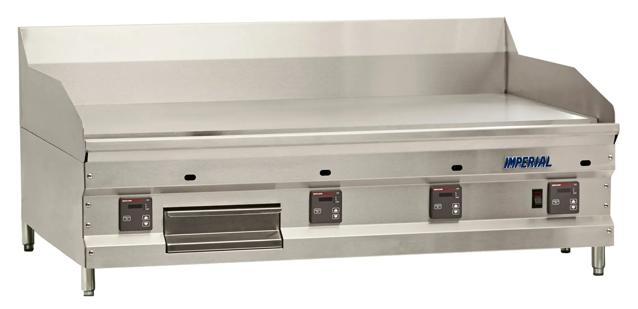 Introducing the Imperial PSG60 Gas Countertop Griddle, designed to simplify restaurant operations and elevate your cooking experience. This professional-grade griddle is perfect for high-volume users and chains, offering exceptional performance and durability. With a full stainless steel exterior and 304 stainless steel interior components, this griddle is built to withstand the demands of a commercial kitchen. The 1" highly polished abrasion-resistant steel griddle plate ensures even heat distribution and superior cooking results. The aeration baffles between each burner enhance efficiency and prevent heat loss. Equipped with highly accurate digital electronic control, you can easily adjust the temperature to suit your cooking needs. The extra-large capacity grease can, full-width grease trough, and grease chute make cleaning a breeze. With one burner every 12" and a low profile landing edge, this griddle provides ample cooking space and easy access. Upgrade your restaurant kitchen with the Imperial PSG60 Gas Countertop Griddle and experience the difference in performance and efficiency.