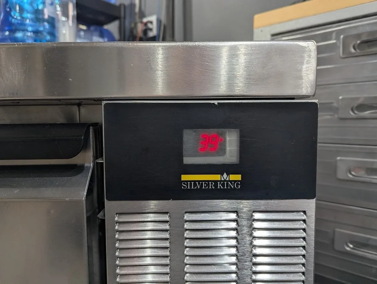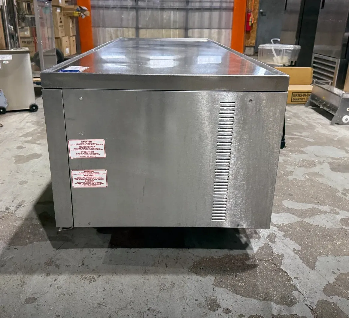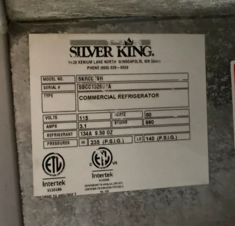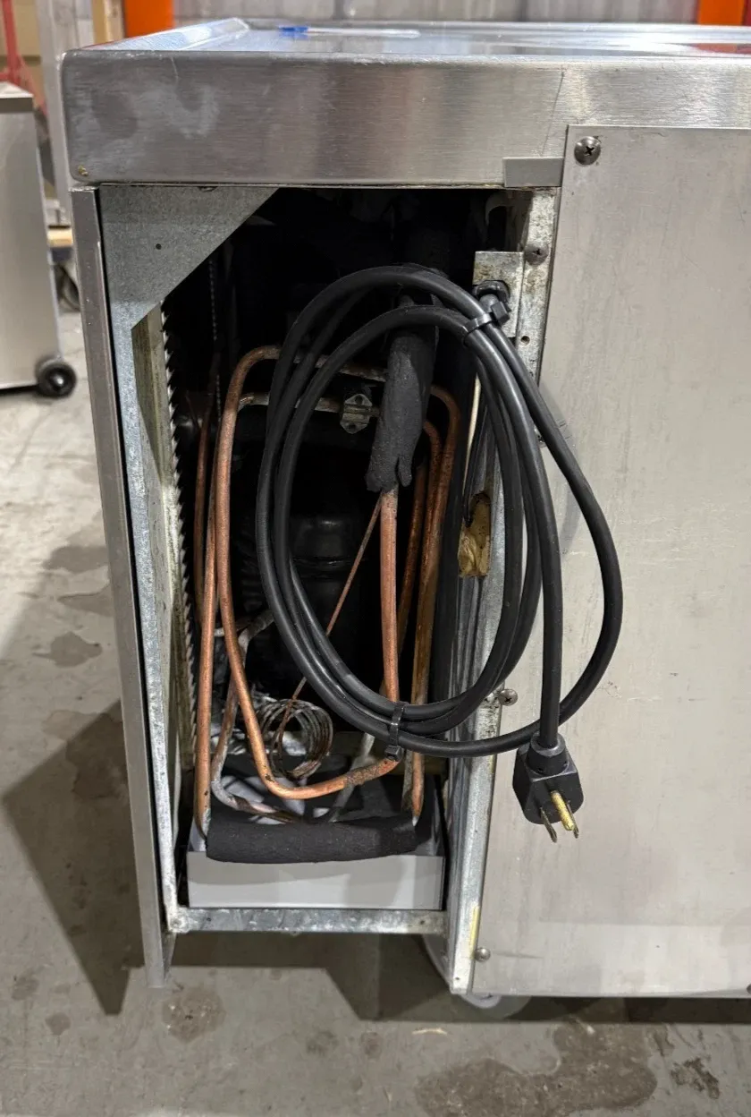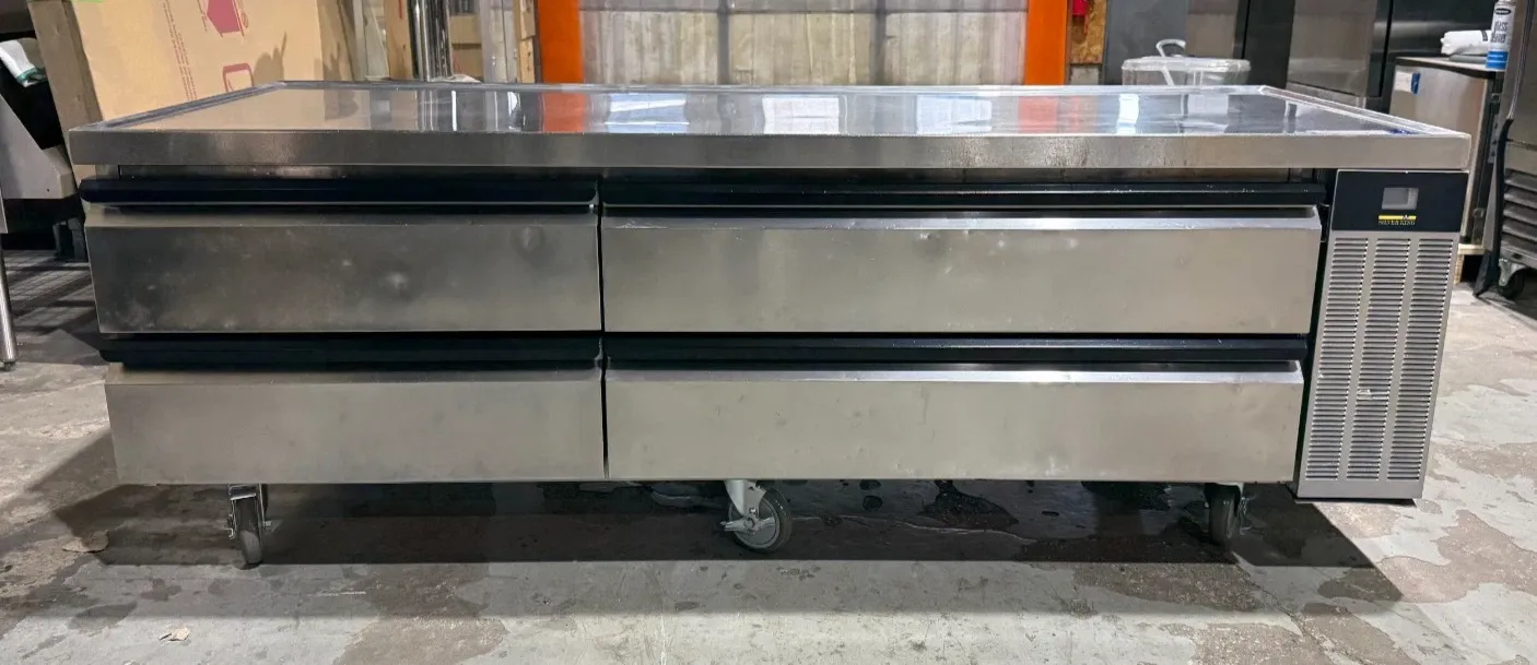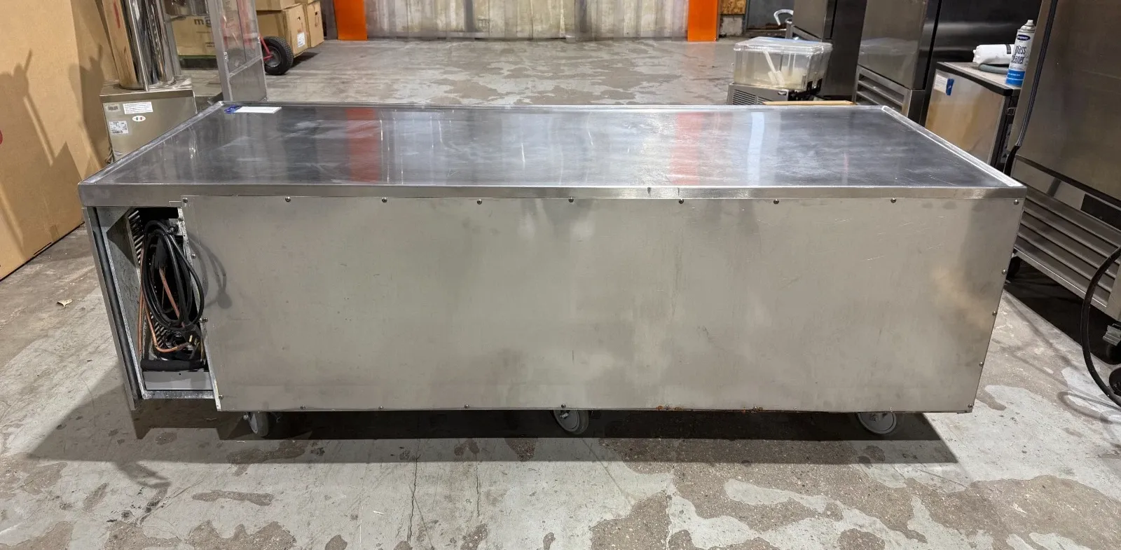 (USED) two-section, 79.52"W, (4) drawers, marine edge top, automatic defrost, aluminum interior, stainless steel & galvanized exterior, 4" casters (3 with locks), side-mounted self-contained refrigeration, R134a refrigerant, 115v/60/1-ph, 3.1 amps, NEMA 5-15P, cETLus, ETL-Sanitation, SN# SBCC132607A