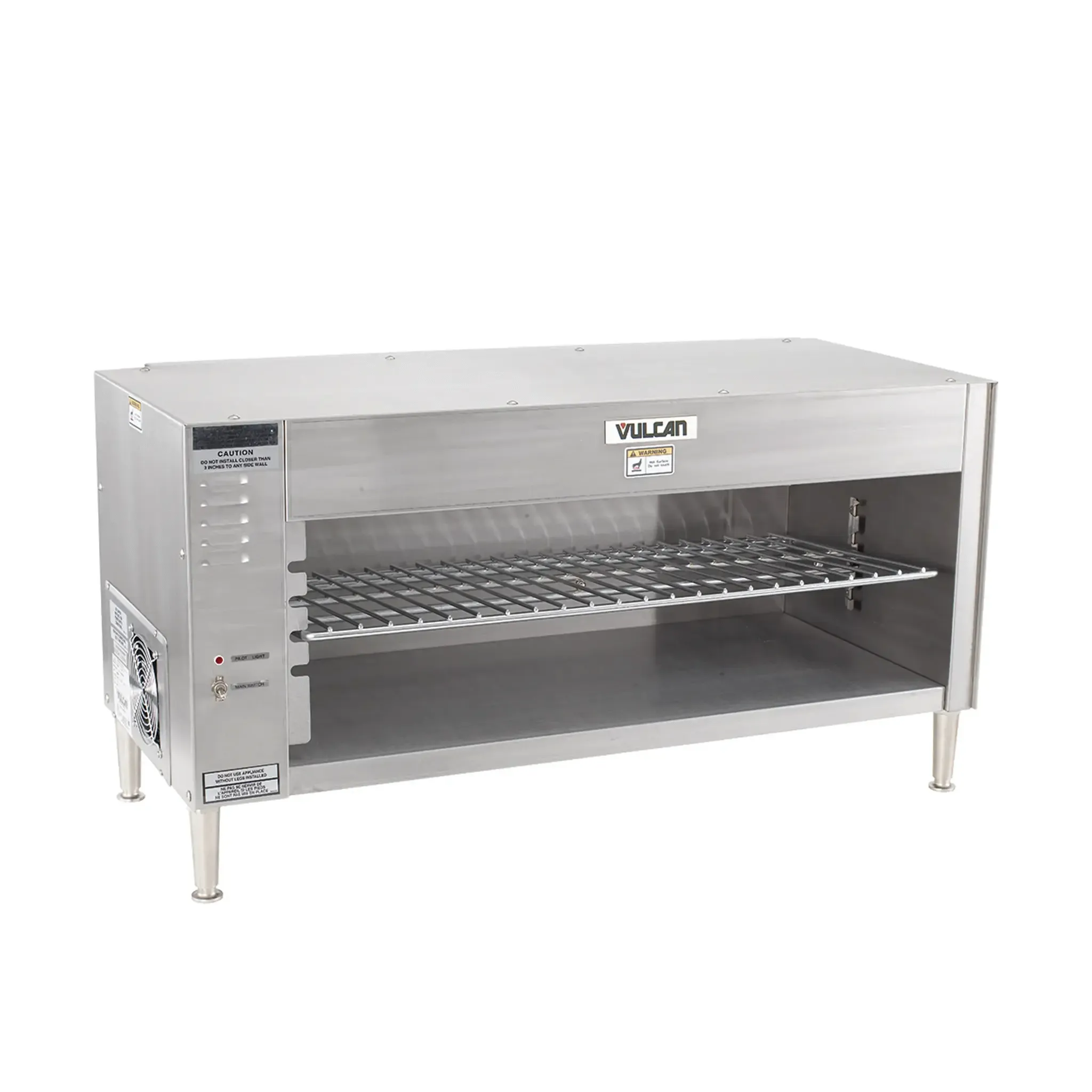 Introducing the Vulcan, 1024, Cheesemelter, Electric - the perfect addition to drive restaurant profitability. This high-quality cheesemelter from Vulcan is designed to meet the demands of a commercial restaurant setting. With its solid state controls and quartz infrared tube heating elements, this cheesemelter ensures precise and efficient heating, allowing you to achieve the perfect melt every time. The stainless steel exterior and interior finish not only provide durability but also make cleaning a breeze. The 27" size and four rack positions offer versatility, allowing you to melt cheese on a variety of dishes. Whether you're melting cheese on pizzas, nachos, or gratins, this cheesemelter delivers consistent results. It comes with 4" adjustable legs for countertop installation or a wall mounting panel, giving you flexibility in your kitchen layout. CSA, UL, and NSF certifications guarantee the safety and quality of this product. Upgrade your restaurant's cheese melting capabilities with the Vulcan, 1024, Cheesemelter, Electric.