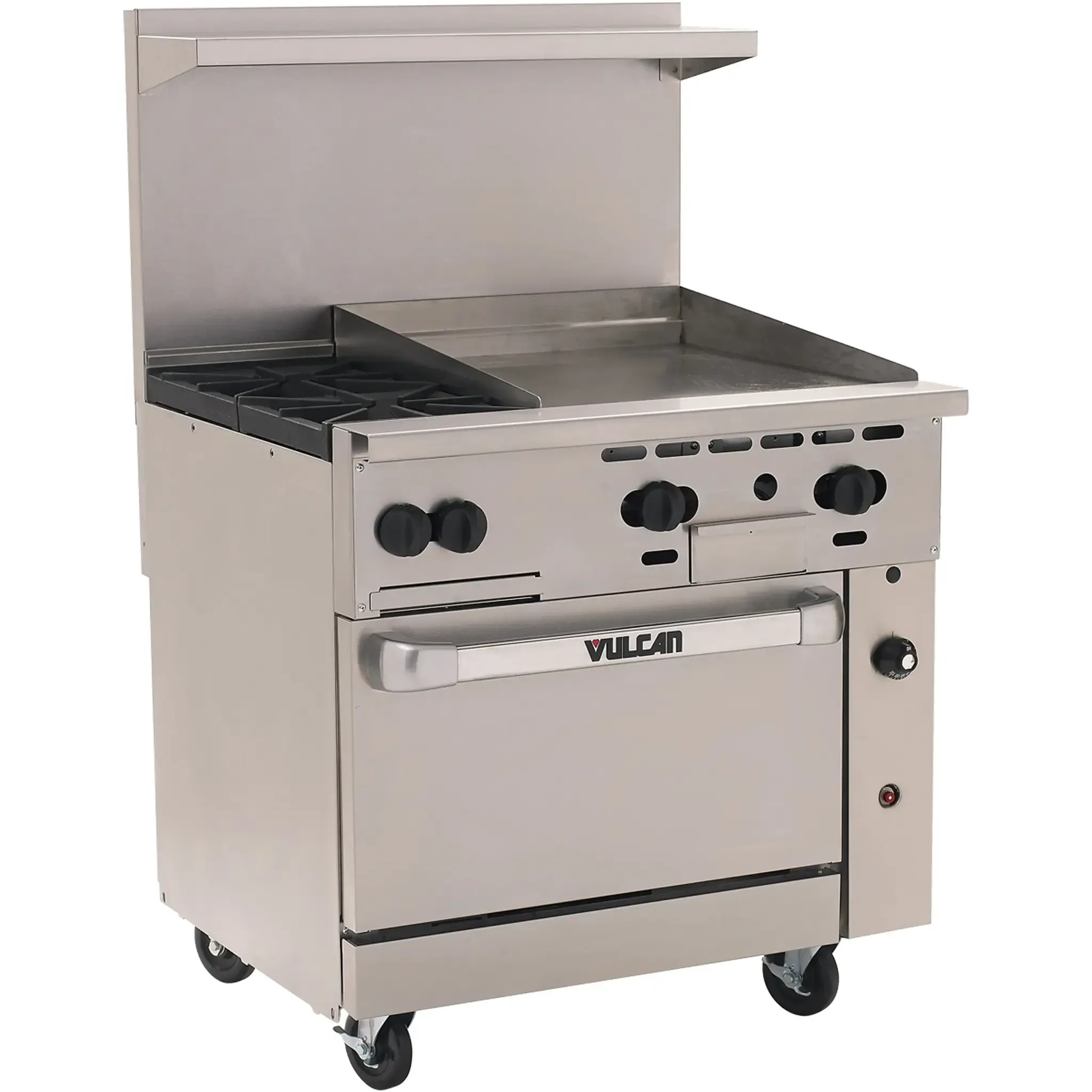 Fuel your restaurant's success with the Vulcan 36S-2B24G Range. This gas-powered endurance restaurant range is designed to meet the demands of a busy commercial kitchen. With two 30,000 BTU burners and a 24" griddle featuring a 3/4" thick plate, this range offers versatility and efficiency. The lift-off burner heads make cleaning a breeze, while the standard oven provides ample space for baking and roasting. The stainless steel front, sides, backriser, and lift-off high shelf not only give this range a sleek and professional look but also ensure durability and easy maintenance. The fully MIG welded chassis and 6" adjustable legs provide stability and sturdiness. With a powerful 135,000 BTU output, CSA Flame and CSA Star certifications, and NSF approval, the Vulcan 36S-2B24G Range is a reliable and high-performing addition to any commercial restaurant.